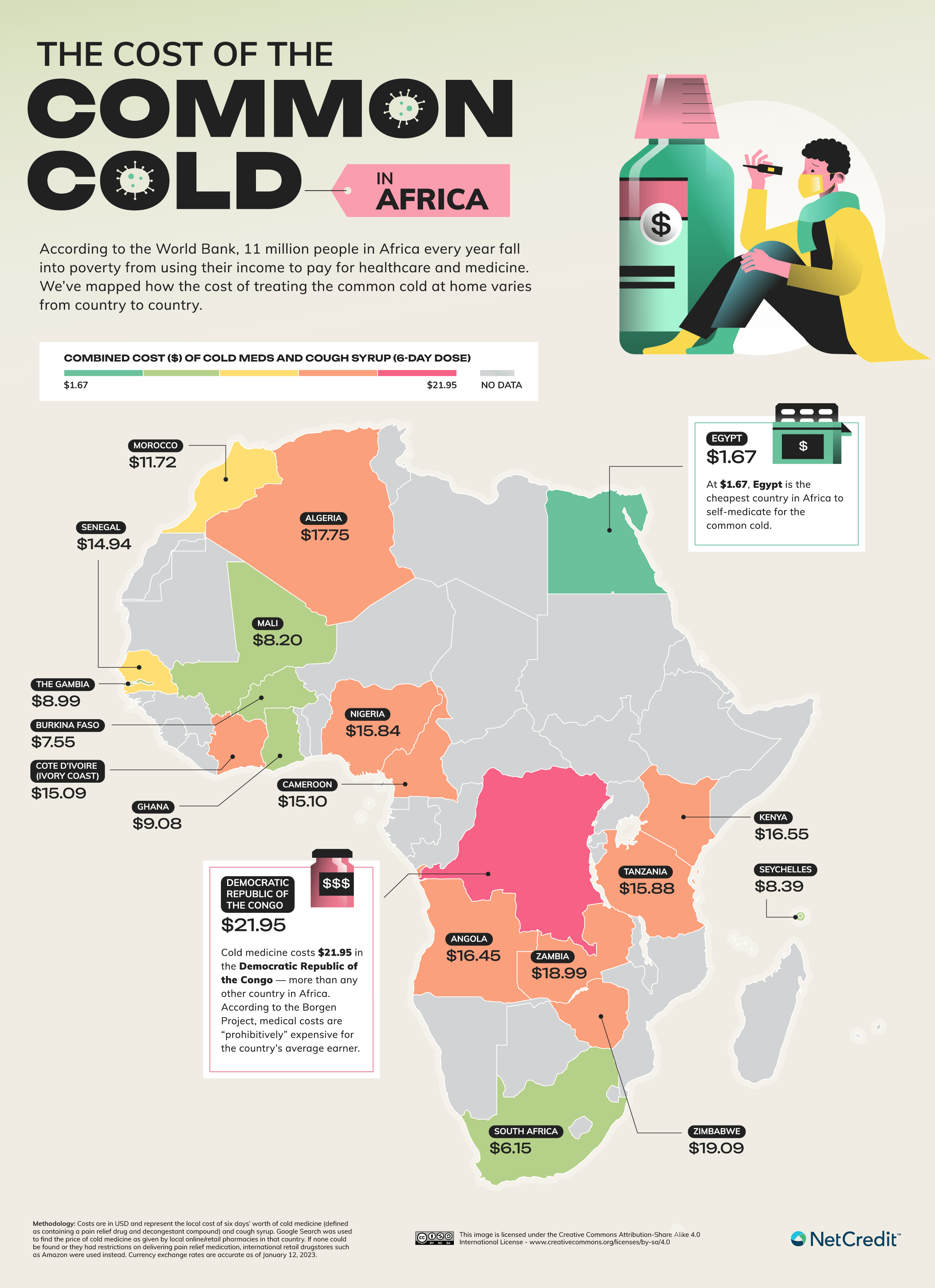 Unfortunately, it’s not a case of if you’ll get a cold, but when you’ll get your next one. The average adult gets two or three colds per year, with around one billion colds affecting the U.S. annually. But if getting sick in America is notoriously expensive, the cost of over-the-counter cold remedies is not the highest in the world. So, NetCredit decided to find how the cost of the common cold stacks up from country to country.