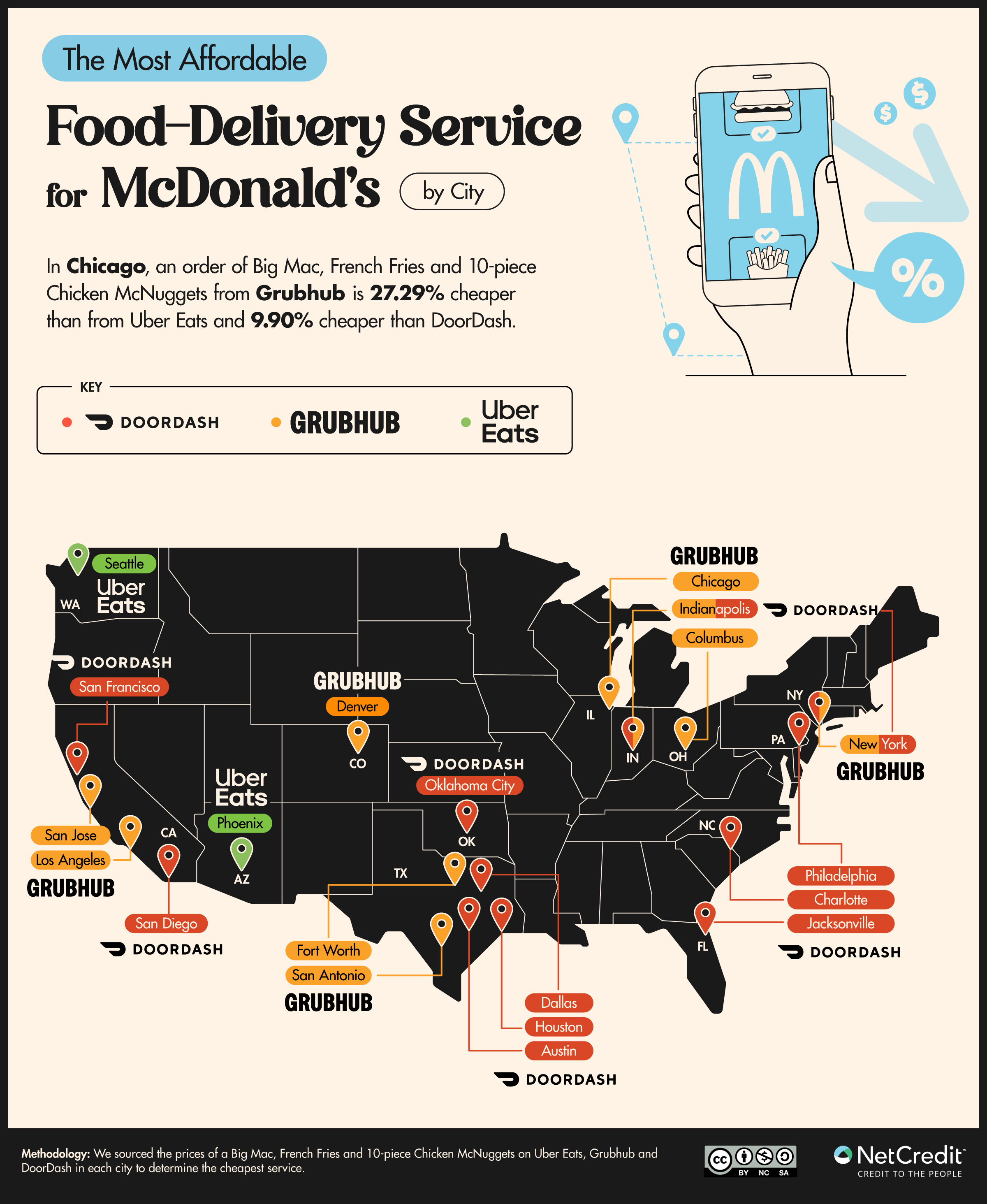 • Uber Eats is the cheapest delivery option for McDonald’s in Phoenix and Seattle, while DoorDash and Grubhub are equally affordable in both Indianapolis and New York City.